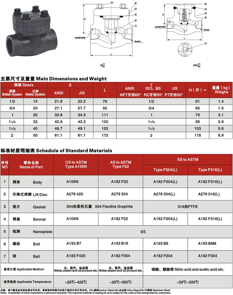鍛鋼內(nèi)螺紋承插焊升降式止回閥